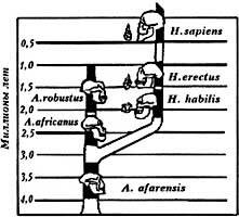 4. Не так давно один из известных антропологов ХХ века - Р. Лики опубликовал данные о находке 1972 г. - черепе "ЕR-1470", принадлежавшем, по мнению автора, человеку современного типа, жившему одновременно с австралопитеками - самыми древними "предками" людей, по эволюционной шкале - около 2 млн. лет тому назад. Эта находка действительно была сенсацией. Впрочем, в современном учебнике по антропологии (22) мы можем найти и такие варианты его оценки - череп Homo erectus'а или даже череп Homo habilis'а, т. е. "предка" эректусов (что такое Homo erectus - см. ниже).