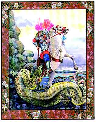 Дошла очередь до единственной царской дочери; но когда она уже стояла возле озера и ждала смерти, явился святой Победоносец Георгий в образе прекрасного юноши, на коне, с копьем наперевес и, осенив себя крестным знамением, проткнул змею горло. Он велел девушке привязать чудовище за шею своим поясом и вести за собой, как собаку. Так они пришли в город. Увидев их, встречные в ужасе бросились бежать, но святой воскликнул: - Не бойтесь, надейтесь на Господа Иисуса Христа и веруйте в Него. Это Он послал меня к вам, чтобы избавить от змея. - И убил чудовище мечом на городской площади, а все жители уверовали во Христа и приняли святое крещение. На том месте построили большую прекрасную церковь во имя Пресвятой Богородицы и в честь святого великомученика и Победоносца Георгия, и в ней тоже совершались чудеса во славу Божию и Его великого угодника. На том месте построили большую прекрасную церковь во имя Пресвятой Богородицы |