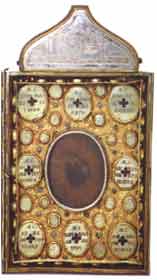 Риза Богородицы, некогда находившаяся во Влахернском храме, в целости не сохранилась, однако части ее, привезенные в Россию в прошлые века, и поныне пребывают на земле, издавна названной уделом Пресвятой Бо-городицы. Так, в музеях Московского Кремля хранятся наперсный ковчег-мощевик XIII-XIV вв. с надписью "Се есть Крест Христов и кровь Его и риза и святая Богородице риза" и киот ризы Богоматери XVII в., за овальным стеклом которого также можно видеть часть ризы Богородицы. В числе кремлевских реликвий - и привезенные в 1383 г. из Царьграда Дионисием, архиепископом Суздальским, святыни, среди которых - часть "от ризы святыя Богородицы юже носяше и от честнаго Ея гроба". В Кремле же находится Влахернская икона Богоматери, названная так по месту ее пребывания во Влахернском храме. В 1653 г. она была подарена царю Алексею Михайловичу и находилась в Успенском соборе. Свидетельствованная грамота сообщала, что икона "сделана смешением от святых мощей и от иного многого благоуханного состава", иными словами, ее изображения являются своеобразным мощевиком. Еще одна Влахернская икона, датируемая приблизительно VII в. и выполненная в технике воскомастики, была подарена "именитым людям" Строгановым и пребывала в храме Влахернской Богоматери в Кузьминках (ныне она входит в собрание Государственной Третьяковской галереи). В результате исследований, проводимых в музее с 1987 г., у нижнего поля иконы под слоем воска была обнаружена узкая полоса ткани - натуральной неокрашенной шерсти черного цвета высококачественного ручного прядения, по различным характеристикам датируемой первыми веками по Рождестве Христове. Предполагают, что это часть ризы Богоматери из Влахернского храма. |
