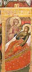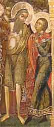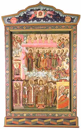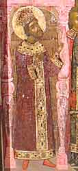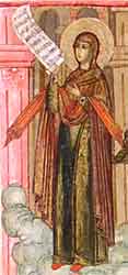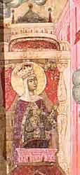 При Льве VI в Константинополь были перенесены многие святыни из Иерусалима. В 911-912 гг., принимая русских послов первого киевского князя из рода Рюриковичей Олега, император "пристави к ним мужи свои показати им церковную красоту... и страсти Господня... и мощи святых, учаще я к вере своей и показующе им истиную веру и тако отпусти я в свою землю с честию великою" (Лаврентьевская летопись). Сын Льва и Зои Константин VII Багрянородный (905-959, правил с 913 г.; Порфирородным или Багрянородным именовался потому, что родился, когда отец его был императором) известен как автор сочинений, рассказывающих о византийско-русских отношениях в X в. В 957 г. Константин с особыми почестями принимал русское посольство во главе с благоверной княгиней Ольгой. Видимо, именно тогда Ольга и была крещена (по другим сведениям, она прибыла в Константинополь, уже приняв крещение в Киеве). Тогда же она получила титул "дочери императора". В верхнем ряду справа изображены архангелы Михаил и Гавриил с зерцалами и мерилами в руках. Рядом с Богоматерью - Иоанн Предтеча, апостолы Петр, Павел и Иоанн Богослов. Далее - святители, коленопреклоненные преподобные и святые жены. "Освящается Небо и земля, Церковь же светится, и людие вси веселятся: се бо Мати Божия со ангельскими воинствы, с Предтечею и Богословом, с пророки же и апостолы, невидимо вшедши, за христианы молится Христу помиловати град и люди, славящия Тоя Покрова праздник" (стихира праздника). |