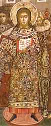 В нижнем ряду иконы стоит Христа ради юродивый Андрей. Он изображен полуобнаженным, указывающим перстом на чудное явление своему ученику Епифанию. Славянин по происхождению, блаженный Андрей в отрочестве попал в услужение к богатому жителю Константинополя. Однажды во сне он увидел себя борющимся с бесом. Видение так поразило юношу, что он принял на себя подвиг юродства, всю жизнь посвятив служению Богу. Святой Андрей почил о Господе около 936 г. В XI-ХII вв. на Руси было переведено его житие. В центре на амвоне - преподобный Роман Сладкопевец, в руках его книга со словами: "Дева днесь в церкви предстоит с лики святых невидимо за ны..." Святой Роман (вторая половина V в.) происходил из Сирии, служил сначала пономарем в Бейруте, затем в Кировой церкви в честь Пресвятой Богородицы в Константинополе и, наконец, в соборе Святой Софии. Он был девственником и подвизался в посте, молитве и добрых делах. Однажды в Навечерие Рождества Христова клирики храма, желая подшутить над Романом, заставили его в присутствии императора выйти на амвон. Не зная грамоты, Роман не смог спеть праздничные песнопения. После службы он горько плакал и молился пред образом Пресвятой Богородицы. И Пречистая Дева явилась ему во сне с книжным свитком в руках, который вложила в уста Романа (это чудо изображено в нижнем правом углу иконы). Проснувшись, Роман ощутил разумение книжное и исполнился великой премудрости. Вечером на всенощном бдении под Рождество Христово он взошел на амвон и запел новый кондак, который сложился у него в уме: "Дева днесь Пресущественнаго раждает..." После этого чуда патриарх поставил его в диаконы. Роман Сладкопевец составил множество кондаков и икосов к Господским и Богородичным праздникам и в честь святых. "Светлейший светильник и прозарнейший, сладковещанная гусль, струна благознаменитых Духа словес" - так именует его Церковь в стихирах праздника. Слева от преподобного Романа - Византийский патриарх Тарасий (784-806), почитаемый и Греческой, и Русской Православной Церковью. На VII Вселенском Соборе Тарасий выступал против еретиков-иконоборцев и ратовал за восстановление почитания икон. Под образом Спасителя, слева, на царских местах Влахернской церкви - византийский император Лев VI Мудрый (866-912, правил с 886 г.) и его супруга Зоя. Именно в их правление блаженный Андрей, Христа ради юродивый, сподобился видения Божией Матери. До наших дней над входом в Софийский храм сохранилось мозаичное полотно конца IX в. с Господом Вседержителем на престоле и павшим перед Ним на колени императором Львом VI. Изображение императора с характерной бородой лопатой (как и на иконе из Благовещенского храма) имеет портретное сходство. |