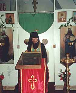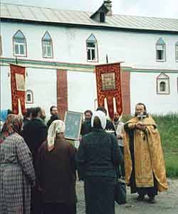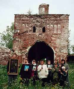 При въезде в пустынь нашему взору открылась удручающая картина запустения: заросли бурьяна, битый кирпич, мусор... В полуразрушенной Успенской церкви, где с уцелевших фресок на нас смотрели лики святых, мы прочли акафист святителю Митрофану и, помолившись о возрождении обители, крестным ходом обошли всю территорию.