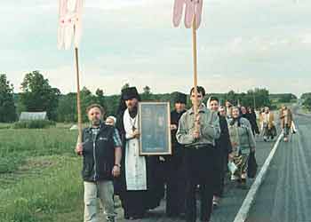 Наш приезд совпал с престольным праздником Рождества Иоанна Крестителя, так что на службу собрались прихожане и паломники из Иваново. После литургии и акафиста святителю Митрофану мы крестным ходом прошли вокруг храма и направились к святому источнику, расположенному неподалеку. Здесь существует традиция на Крещение и Рождество Иоанна Предтечи всем приходом купаться в источнике.