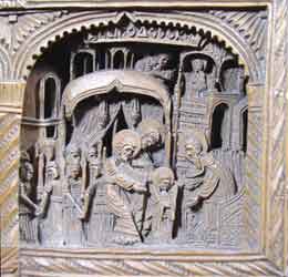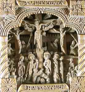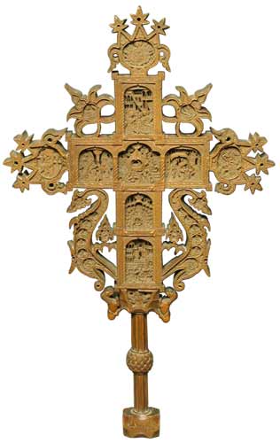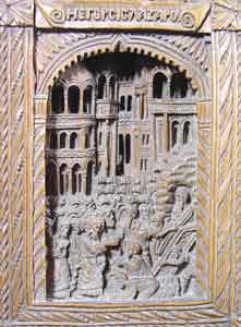 Крест, принадлежащий нашему приходскому музею, двусторонний. Его центральные клейма - двунадесятые праздники, Распятие Христово, Сошествие Святого Духа на апостолов и Воскрешение Лазаря - расположены крестообразно. Во многих из них - удивительно изящные изображения палат с многочисленными арочными окнами, зубчатыми стенами и колоннами тончайшей работы. В расходящихся от креста ветвях, цветах, бутонах и у его основания помещены Святая Троица, Богоматерь "Воплощение" (подобная иконография на Руси получила наименование "Знамение"), Усекновение главы Иоанна Предтечи, видение лествицы патриарху Иакову, пророк Даниил во рву со львами, три отрока в пещи огненной, символы евангелистов и образы праотца Ноя, ветхозаветных пророков и царей, двенадцати сыновей патриарха Иакова, положивших начало двенадцати коленам Израиля, равноапостольных Константина и Елены, преподобных Симеона и Даниила столпников, святителей Николая Мирликийского и Спиридона Тримифунтского. |