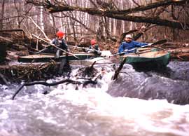 Десантировавшись на небольшой станции под названием "Шугарово", все сразу приступили к активным действиям: облачились в гидрозащитные костюмы и бодро зашагали на берег реки. Холодный ветер и дождь ничуть не мешали - все члены отряда работали четко, слаженно и без промедления. После небольшого обеда, завершив последние приготовления... ринулись в "бой"! С трудностями пришлось столкнуться почти сразу - через двадцать метров речка оказалась завалена бревнами и камнями. Пришлось вытаскивать байдарки из воды и на руках переносить через препятствия (средний вес байдарки приблизительно 150 кг!). Препятствия подобного рода пришлось преодолевать все три дня нашего путешествия, впрочем, к этому мы привыкли очень быстро. Прохождение маршрута первого дня завершилось поздним вечером. Выбравшись на берег, сразу поставили палатки и, поужинав, легли спать, напоследок выпив замечательного какао, приготовленного о. Александром. День второй встретил нас радостными и теплыми лучами весеннего солнца. С отличным настроением мы вновь включились в "трудовые будни" - в короткий срок убрали палатки и приготовили завтрак. Последнее обстоятельство многократно укрепило наши силы, и мы вновь были готовы к нелегким испытаниям. На этот раз ими стали пороги. Расслабляться было некогда, и полдня пролетели как один час. Время привала пришло незаметно. После перерыва на обед путешествие продолжилось... К счастью, река была уже не так загромождена, и появилась возможность больше внимания уделять "достопримечательностям". В основном это были многочисленные родники, бившие по берегам, а также последствия деятельности бобров - бессчетное количество плотин, а также поваленных и погрызанных деревьев. Нужно отметить, что завалы на реке явились прямым результатом работы этих животных. Необходимо было набраться сил перед последним днем экспедиции, поэтому на ночлег мы встали еще засветло. Третий день для нас начался ранним утром. Предстояло выполнить много сложной и напряженной работы: пройти в кратчайший срок оставшийся отрезок пути, разобрать байдарки, просушить и упаковать все вещи и при этом не опоздать на поезд. По этой причине делать все, начиная от снятия палаток и кончая скоростью движения и разгребания завалов по пути, нужно было намного быстрее, чем раньше. Но мы справились. Другого и быть не могло, ведь основной целью похода и являлось преодоление преград и трудностей! Поход завершился. Остались яркие воспоминания о прошедшем и грандиозные планы на будущее... Сергей Александрович Докин |