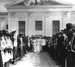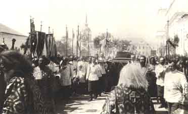 19 июля. Суббота Встали в 7 1 и через час пошли к Мама и затем к обедне, которая длилась вместе с молебном с 9 ч. до 12 1 ч. Так же умилителен, как вчера, был крестный ход с гробом, но с открытыми мощами. Подъем духа громадный и от торжественности событий, и от поразительного настроения народа. Закусили у Мама и в 2 1 кушали в трапезной. Отдыхали около часа. Жара была сильная, пыль от массы богомольцев также. В 4 1 отправились в павильон Тамбовского дворянства, которое угостило нас чаем. В 7 1 обедали у Мама. Затем по два и по три пошли к источнику, где с особым чувством выкупались из-под крана студеной воды. Вернулись благополучно, никто в темноте не узнавал. Слыхали о многих исцелениях сегодня и вчера. В соборе во время обнесения святых мощей вокруг алтаря случилось также одно. Дивен Бог во святых Его. Велика неизреченная милость Его Дорогой России; невыразимо утешительна очевидность нового проявления благодати Господней ко всем нам. На Тя, Господи, уповахом, да не постыдимся во веки. Аминь! |