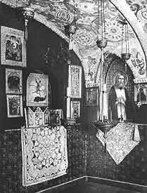 1906 3 июля ...Поехали в Дивеевское подворье, где осматривали новую рисовальную школу... 18 октября ...Посетил новую церковь Дивеевской обители... 1912 20 августа ...В 9 ч. отправился всей семьей в Царское Село, только без Алексея. В 10 ч. началось освящение нашей полковой церкви [35]. Она вышла замечательно красивой и совсем в духе московских старинных церквей. Нам она очень понравилась, также и нижняя церковь вроде пещерной. Служба окончилась в 12 ч. |
