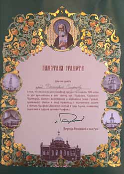 Увеличилась и коллекция музея - в экспозицию включена грамота Святейшего Патриарха Алексия, выданная нашему настоятелю в память об участии в Саровских торжествах "с возношением молитв у святынь Серафимо-Дивеевской обители и града Сарова, освященных подвигами и трудами батюшки Серафима", а также привезенные о. Димитрием камень от кельи и стекло от раки старца Серафима.