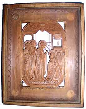 В витрине с реликвиями Святой Земли и Троице-Сергиевой Лавры выставлены деревянные резные работы мастеров Сергиева Посада XIX в.: икона "Явление Богоматери с апостолами Петром и Иоанном преподобному Сергию Радонежскому", фрагменты Распятия Христова с предстоящими Богоматерью и Иоанном Богословом (подобные композиции размещали в бутылях) и бесхитростно сработанные куколки, которых дарили детям, посещавшим монастырь.