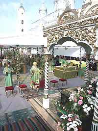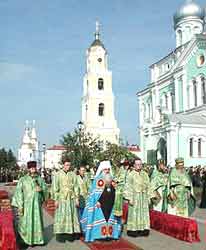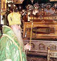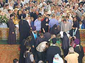 30 июля - 1 августа празднества продолжились в Сарове и Дивеево. В программу входило освящение восстановленных святынь: в Сарове - подземной церкви Антония и Феодосия Печерских (1706-1711 гг.), Иоанно-Предтеченского храма, церкви Святого Пантелеимона в больничном городке, кельи преподобного в дальней пустыньке; в Дивеево - храма Казанской Божией Матери (преподобный Серафим предсказывал, что он будет монастырским собором), Мельничной часовни, архиерейского корпуса, полностью завершенной Богородичной канавки. К юбилею Церкви был передан домик блаженной Паши Саровской, где восстанавливается внутреннее убранство ее кельи и будет создан музей Дивеевского монастыря. К торжествам в обитель подоспели три крестных хода - один из них из Курска, другой - из Нижнего Новгорода. 30 июля епископ Нижегородский и Арзамасский Георгий отслужил панихиду на могилах схимонахини Параскевы (Паши), Пелагии и Марии Дивеевских, а на следующий день во время торжественной литургии в новоосвященном Казанском храме эти подвижницы были причислены к лику святых. 1 августа, в самый день празднования 250-летия со дня рождения преподобного Серафима, состоялось торжественное богослужение на Соборной площади Дивеевского монастыря, которое транслировалось на два больших экрана, установленных на территории обители. После службы было освящено новое здание средней школы, ранее располагавшейся на территории Богородичной канавки, а ключи от старого здания были символически переданы настоятельнице монастыря. В завершение празднований в Нижнем Новгороде открылась православная выставка-ярмарка "Нижегородский край - земля Серафима Саровского". |