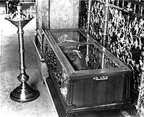 В этот же день приехал игумен Митрофан и предложил ему принять монашеский постриг. Батюшка согласился на «первоначальный чин» и был пострижен в рясофор с именем Иосиф. Прощаясь, о. Митрофан поклонился ему в ноги, и они со слезами обнялись. Отец Роман хотел сохранить постриг в тайне, но о нем стало известно через келейниц игумена Митрофана. Все последующие дни умирающий причащался, а 6 сентября сказал: «Смерть на расстоянии двух дней, и тогда конец. Остались последние денечки. Я поставлен Господом быть ответчиком — и буду как пример для других». Продиктовал письмо духовным детям: «Дорогие, все бывшие духовные дети мои! Я тяжко болен, и дни мои сочтены. Христиане перед смертью прощаются и примиряются друг с другом. Прошу простить меня во всем, в чем я согрешил перед вами: делом, словом, помышлением. Со своей стороны во всем, в чем вы согрешили против меня, я властию, мне данной от Господа нашего Иисуса Христа, прощаю и разрешаю во имя Отца и Сына и Святаго Духа. Недостойный протоиерей Роман Медведь». Ночью, указывая вверх, он сказал: «Свет Божественный здесь... Расчеты сводятся к концу... Давайте скорее кончать...» В четыре часа успокоился и произнес: «Слава Богу, хорошо!..» 8 сентября в шесть утра батюшка причастился и весь день лежал почти не шевелясь, с закрытыми глазами. Около пяти вечера открыл глаза, протянул руки вперед, и его лицо озарилось сердечной и кроткой улыбкой. Затем откинулся на подушку и впал в полузабытье. У него начали холодеть руки и ноги, и духовная дочь стала читать молитвы на исход души. Отец Роман открыл глаза, посмотрел высоко вверх, потом повел глазами вправо и склонил голову к плечу. Вздохнул еще несколько раз, и душа его отошла ко Господу. Было семь часов вечера. Отпевал почившего о. Зосима. Погребли его на городском кладбище в Малоярославце. 3 августа 1999 года мощи исповедника были обретены и перенесены в Москву, в храм Покрова Божией Матери на Лыщиковой горе. Юбилейный Архиерейский Собор 2000 года прославил протоиерея Романа Медведь в лике Новомучеников и исповедников Российских. Память его совершается в день кончины, 8 сентября по новому стилю. Еще при жизни святого по его молитвам совершались исцеления. Весной 1932 года у его духовной дочери двадцатипятилетней Ксении Калошиной началось воспаление подъязычной железы. Пять дней она не могла ни есть, ни пить, температура держалась около 40 градусов. Шею раздуло так, что она стала шире головы; язык опух и посинел. Больная чувствовала, что умирает. Ее мать все время мысленно обращалась к о. Роману, и ночью батюшка явился Ксении — в красном священническом облачении и с Чашей в руках. Он благословил и причастил ее, после чего она начала поправляться. |