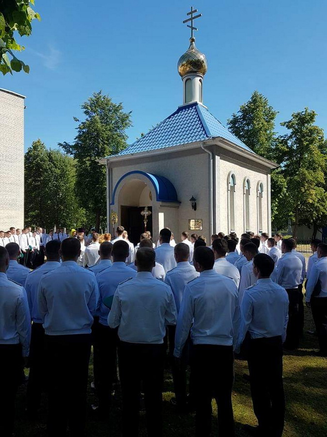 По благословению архиепископа Калининградского и Балтийского Серафима, по сложившейся доброй традиции, перед началом выпускного, у мемориального храма преподобного Илии Муромца, протоиерей Вадим Неткачев совершил благодарственный молебен перед строем выпускников института.