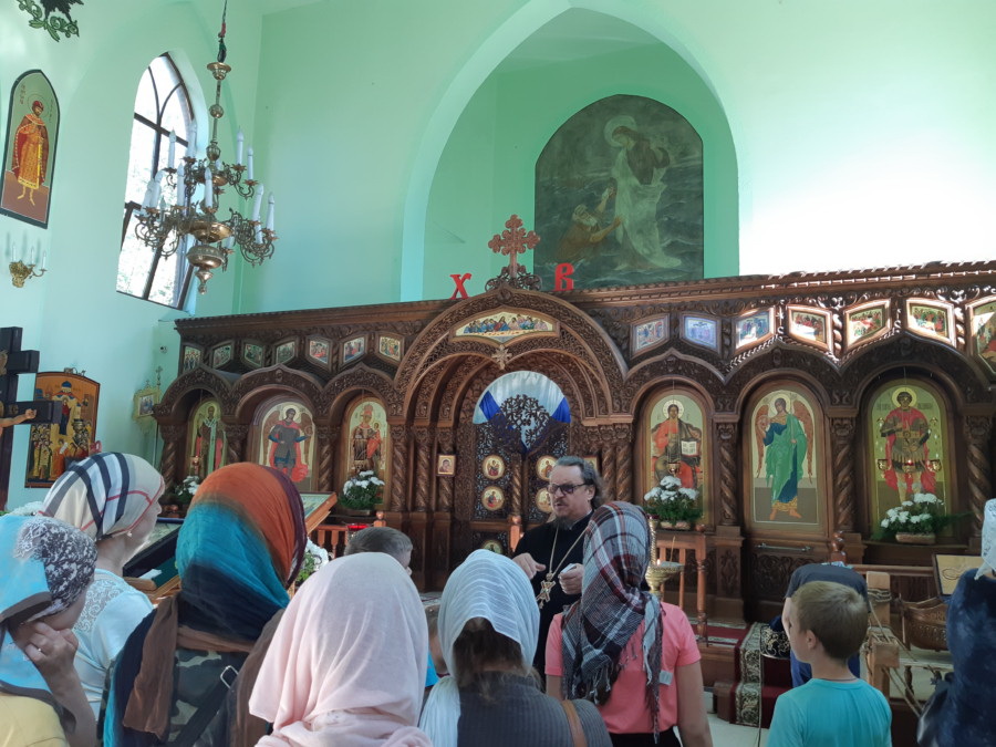Путешественники посетили храм св. вмч. Георгия Победоносца. Настоятель храма — архимандрит Софроний (Колосов) к бесконечному изумлению ребят и их родителей рассказывал и раскрывал уникальную символику храма, его внутреннего убранства. Из множества деталей иконостаса перед ребятами раскрывался целый мир, сотворенный Богом, прекрасный и удивительно сложный. Кометы, облака, цветы и обитатели вод – вся жизнь как будто замерла под его деревянной оболочкой, восхваляя Создателя. Здесь же, проявляясь в множестве деталей, открылась и неразрывная связь этого храма с морем и моряками. Андреевский флаг, мощи святых покровителей моряков: апостола Андрея Первозванного, великомученика Георгия Победоносца и праведного воина Федора Ушакова, а также изображения архангелов в плащах особенной расцветки.