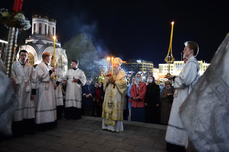 Как обычно, центром праздника Пасхи в Калининграде стал Кафедральный собор Христа Спасителя. Пасхальные богослужения, - полунощницу, крестный ход, Пасхальную заутреню и Божественную литургию свт. Иоанна Златоуста, - здесь возглавил архиепископ Калининградский и Балтийский Серафим. Его Высокопреосвященству сослужили: ключарь собора протоиерей Михаил Селезнев и епархиальное духовенство.