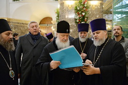 В соборе Предстоятеля Русской Православной Церкви встречали губернатор Калининградской области Н.Н. Цуканов, епископ Балтийский Серафим, мэр г. Калининграда А.Г. Ярошук. О ходе работ по художественному украшению интерьера кафедрального собора Его Святейшеству рассказал член Союза художников России и Патриаршего совета по культуре, древлехранитель Московской городской епархии протоиерей Леонид Калинин.