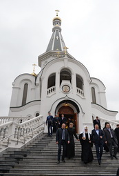 По окончании епархиального собрания Предстоятель Русской Церкви посетил храм святого праведного Иоанна Кронштадтского в г. Славске.