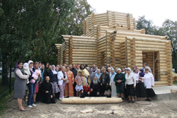 Утром 21 сентября, в праздник Рождества Пресвятой Богородицы, началось возведение нашего обыденного храма. Началось с четвертого венца бревен, другие три уже лежали. До вечера были собраны все стены. Многие люди заходили на территорию и помогали поднести бревна, помогали в других работах. Днем мы отслужили молебен, на который собрались сотни местных жителей. Кроме того, Андрей Антонович Поклонский привез из Москвы гостей, которые и бревна поносили, и выступили перед калининградцами. Мне запомнились стихи Бориса Галкина, песня Антона и Виктории Макарских, слово Авраама Руссо. Потом мои знакомые по городским приходам спрашивали, почему я не предупреждал, что на строительство храма приедут «звезды», они бы тоже пришли. Но не надо путать: мы приглашали всех на строительство храма, а не на артистов. Кто хотел положить свое бревно, тот и положил.